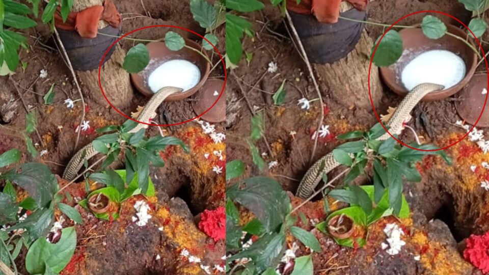 శనివారం సరిగ్గా నాగుల చవితి పర్వదినం రోజున శ్రీకాకుళం జిల్లాలో ఇలాంటి అద్భుతమే ఒకటి జరిగింది. జిల్లాలోని పలాస మున్సిపాల్టీ పరిధిలోని శాసనం కాలనీలో నాగులచవితి సందర్భంగా భక్తులకు నాగు పాము కనిపించింది. నాగులచవితి పర్వదినం సందర్భంగా శనివారం ఉదయం స్థానికంగా ఓ చెట్టు కింద ఉన్న పుట్ట వద్ద భక్తులు చాలా భక్తిశ్రద్ధలతో నాగేంద్ర స్వామికి పాలు, గుడ్లు వేసి పూజలు చేస్తుండగా కాసేపటికి అదే పుట్టలో నుంచి బుసలు కొడుతూ నాగు పాము బయటకు వచ్చింది. అది చూసిన భక్తులు సంబ్రమాశ్చర్యాలకు లోనయ్యారు. మొదట బయటకు వద్దామా వద్దా అన్నట్టు పుట్టలో నుంచి తలను బయటకు పెట్టి అటు ఇటూ చూసిన పాము కాసేపు అంతా సైలెంట్గా ఉండేసరికి నెమ్మదిగా బయటకు వచ్చింది. పుట్ట వద్ద భక్తులు పెట్టిన పాలను సైతం తాగి అందరిని ఆశ్చర్యానికి గురి చేసింది. దీంతో అవాక్కయిన భక్తులు భక్తి భావంతో నాగుపాముకి దండంపెట్టి తామంతా అదృష్టవంతులమంటూ మొక్కుకున్నారు. ఈ ఘటన ఆ ప్రాంతంలో ఇపుడు వైరల్ అవుతుంది. భక్తిశ్రద్ధలతో పుట్ట ప్రాంగణాన్ని శుభ్రం చేసి, పసుపు, కుంకుమ సమర్పించి, పుట్ట వద్ద గుడ్లు, పాలు వేసి పెద్ద ఎత్తున పూజా కార్యక్రమాలు నిర్వహిస్తున్నారు భక్తులు.