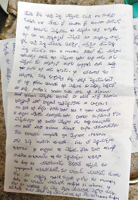 “అతడితో పెళ్లి వద్దని అమ్మానాన్న చెప్పారు. నా జీవితం ఆగమవుతుందన్నారు. హెచ్ఐవీ అంత ప్రమాదమని నాకు తెలియదు. ఇంట్లోవాళ్లంతా చెప్పాక హెచ్ఐవీ ఎంత సీరియసో తెలిసింది.. అమ్మా క్షమించు.. నువ్వు కష్టపడి చదివించినా నా జీవితం నాశనం చేసుకున్నా. మరో జన్మ ఉంటే నీ కడుపులోనే పుట్టాలని కోరుకుంటున్నా. చిన్నా, మున్నా అమ్మానాన్నలను జాగ్రత్తగా చూసుకోండి. వాళ్లు చెప్పినట్లు వినండి. నన్ను క్షమించండి.. గౌరవం, విలువ పోయాక బతకడం బాగాలేదు” అంటూ లేఖలో తన వేదన పంచుకుంది.